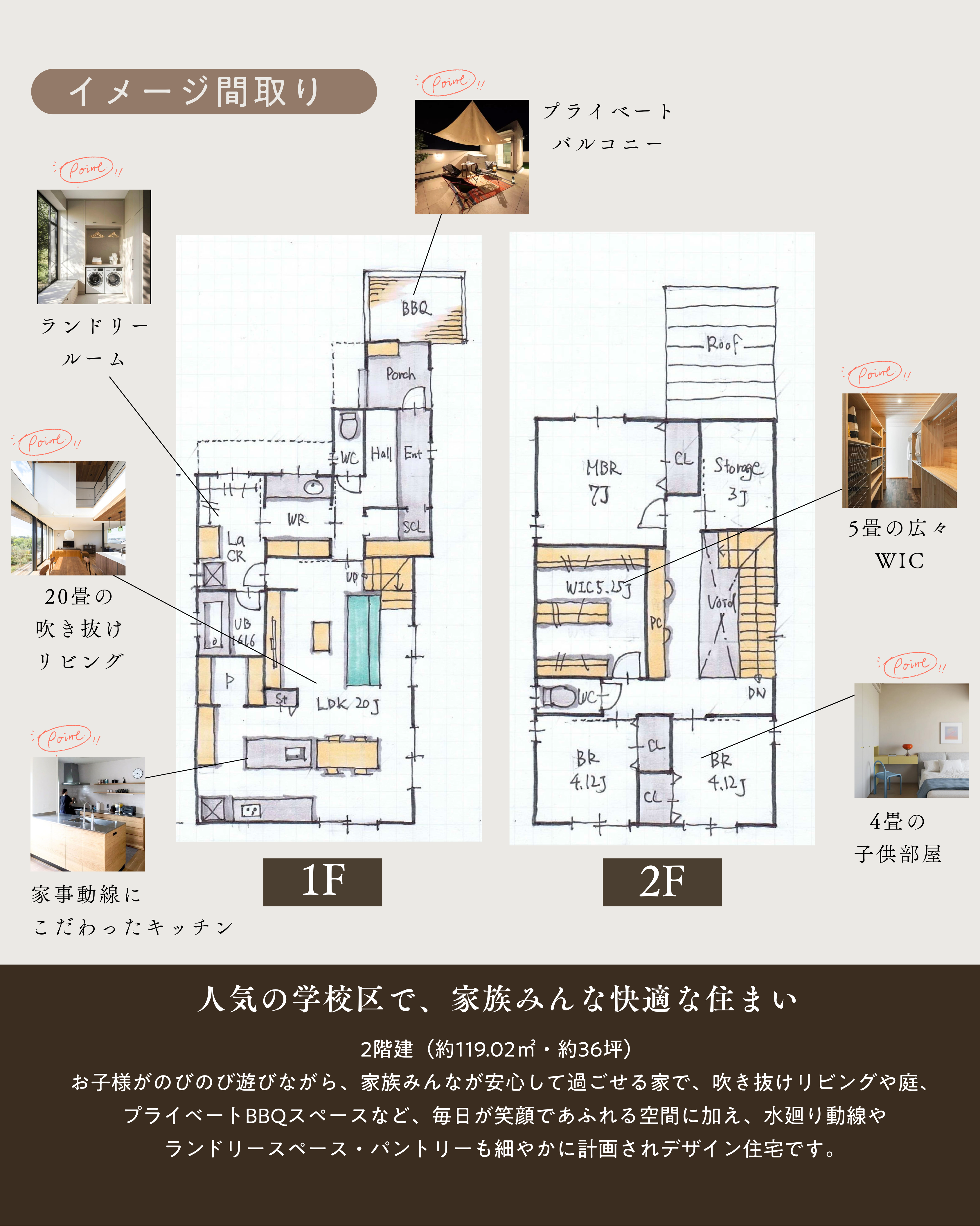 【🚶♀️ 徒歩11分に小学校・中学校で子育て世代にもおすすめな物件✨】です。お子様がのびのび遊びながら、家族みんなが安心して過ごせる家で、吹き抜けリビングや庭、プライベートBBQスペースなど、毎日が笑顔であふれる空間に加え、水廻り動線やランドリースペース・パントリーも細やかに計画されデザイン住宅です。